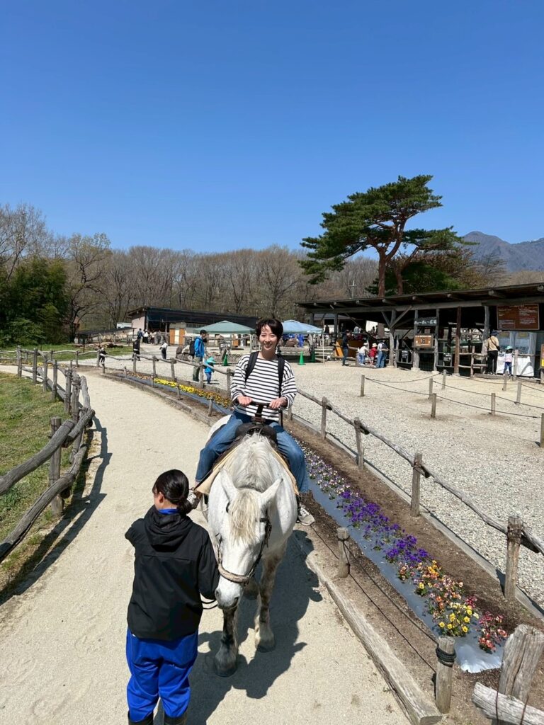 一方、はたらく乗り物にしか興味のない息子氏は、園内にあったショベルカーやホイールローダーに夢中(笑)動物には見向きもせず「あっショベルカー!」と喜んでいました。そんな息子を尻目に母は一人で乗馬体験(笑)夫と息子に見送られながらお馬さんとのふれあいを楽しませていただきました。