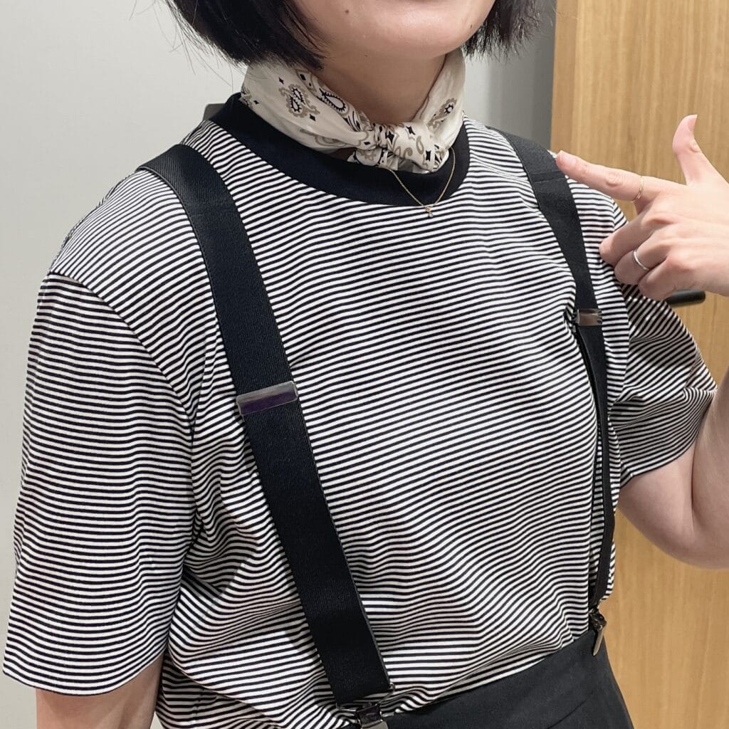 石上さんは私の雰囲気を見て、トップスにSLOANEのボーダーを合わせてくれました。私、SLOANEのトップスが大好きでちょくちょくブログを書いているのですが、(え、石上さん、私の好み知っていましたか?…いや、そんなはずはない…)このボーダートップスも素晴らしい!着丈が絶妙で、首のつまりが丁度よく、首回りが黒で、ありそうでなかなかないデザイン!次にトップスを買うなら絶対コレ!と、お気に入りに登録完了。