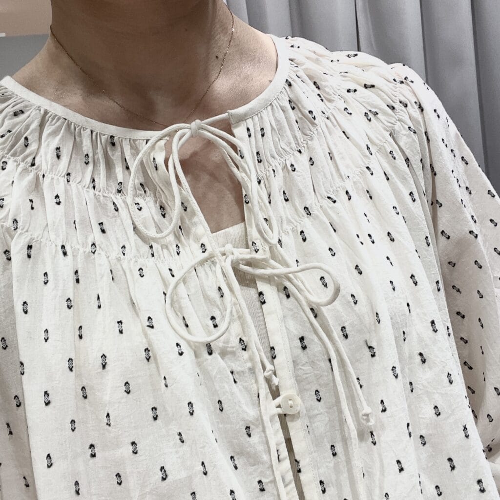 フロント部分にリボンがついているのですが、細めのリボンなので、アイロンかけなくてもいい。(リボンがついたブラウスはアイロンをかけないと、だらーんとなってしまう気がしてなかなか手が出なくて…)かわいさと気軽さを兼ね備えたトップスです。近くで見るとドットの刺繍も丁寧に施されていて、リアルに手に取ってみて、良さを実感!