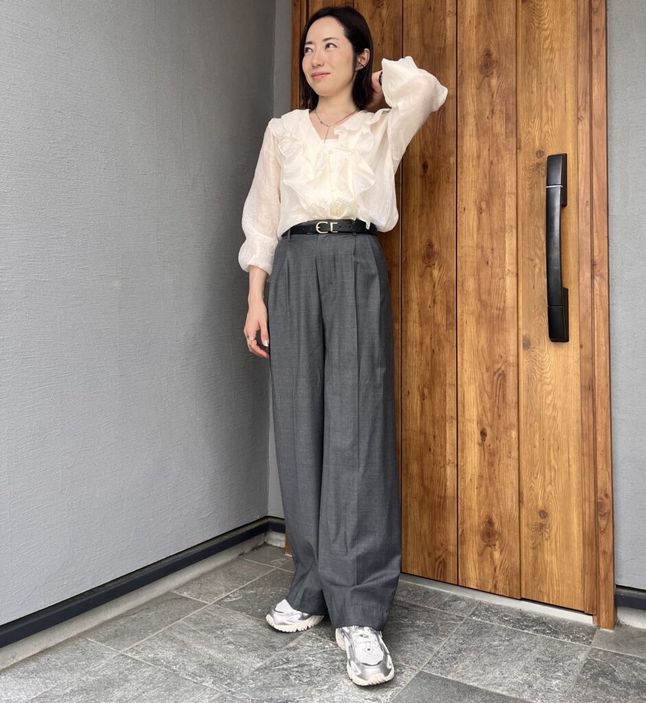 フェミニンなトップスの日も、スタイリッシュ×スポーティな725が甘さを抑えてくれます。トラウザーにもばっちり合います♬