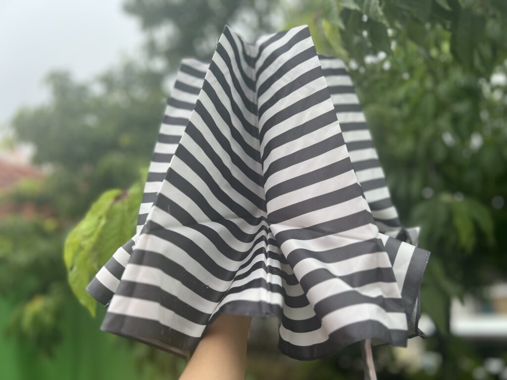 ぱっと傘を開いたらこんな感じです。雨が続く中でお出かけの気分がどうしても沈みがちですが、この傘のおかげで気分がぐっと上がりとても気に入っています。
