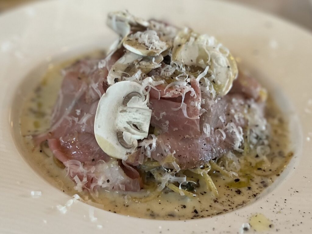 パスタは自家製プロシュートコットときのこのクリームソース。クリーミーなソースに生マッシュルームが良いアクセントになっていてとても美味しかったです◎