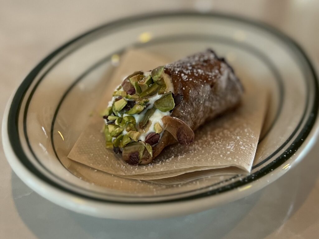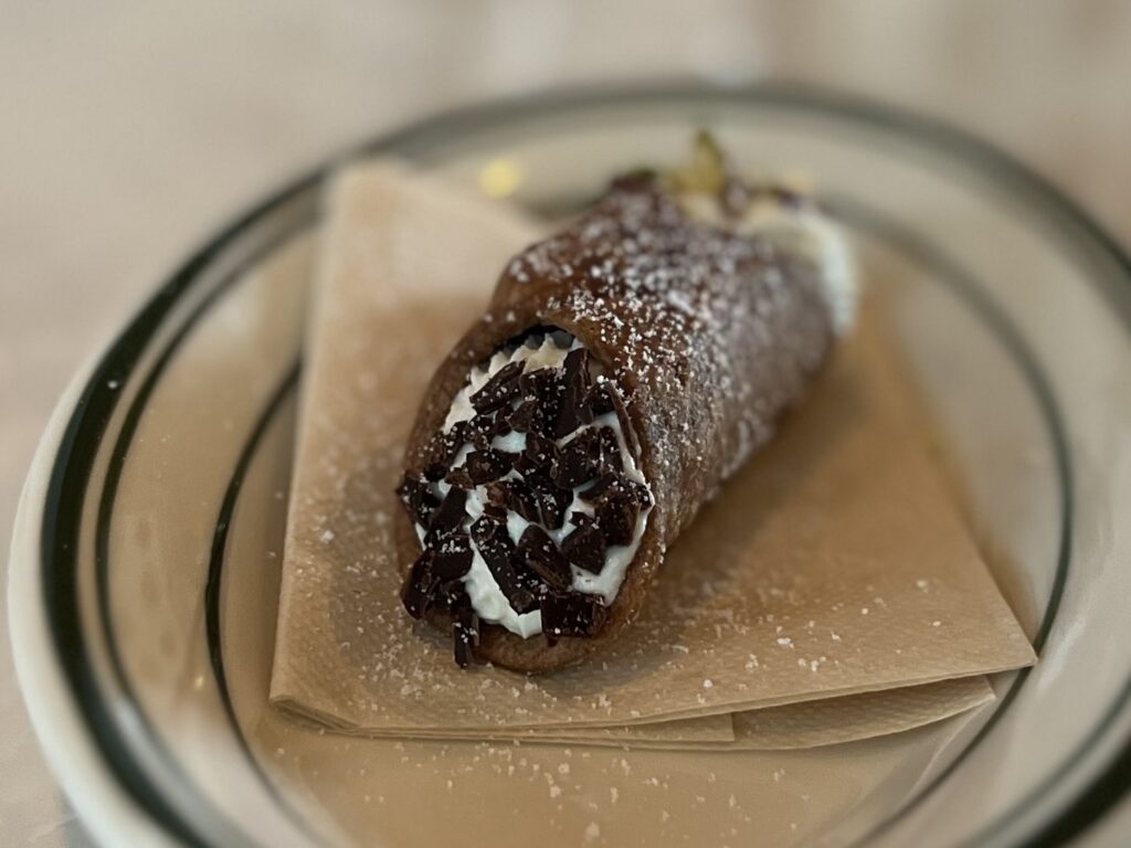 デザートも気になって、イタリアの焼き菓子「カンノーロ」をいただきました。片側にはクラッシュされたピスタチオがクリームにくっついていて、