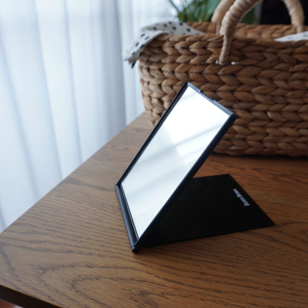 リアルックミラーを開くとこんな感じ。手で持っても良き大きさですが、置いてみるとこんな感じです〜