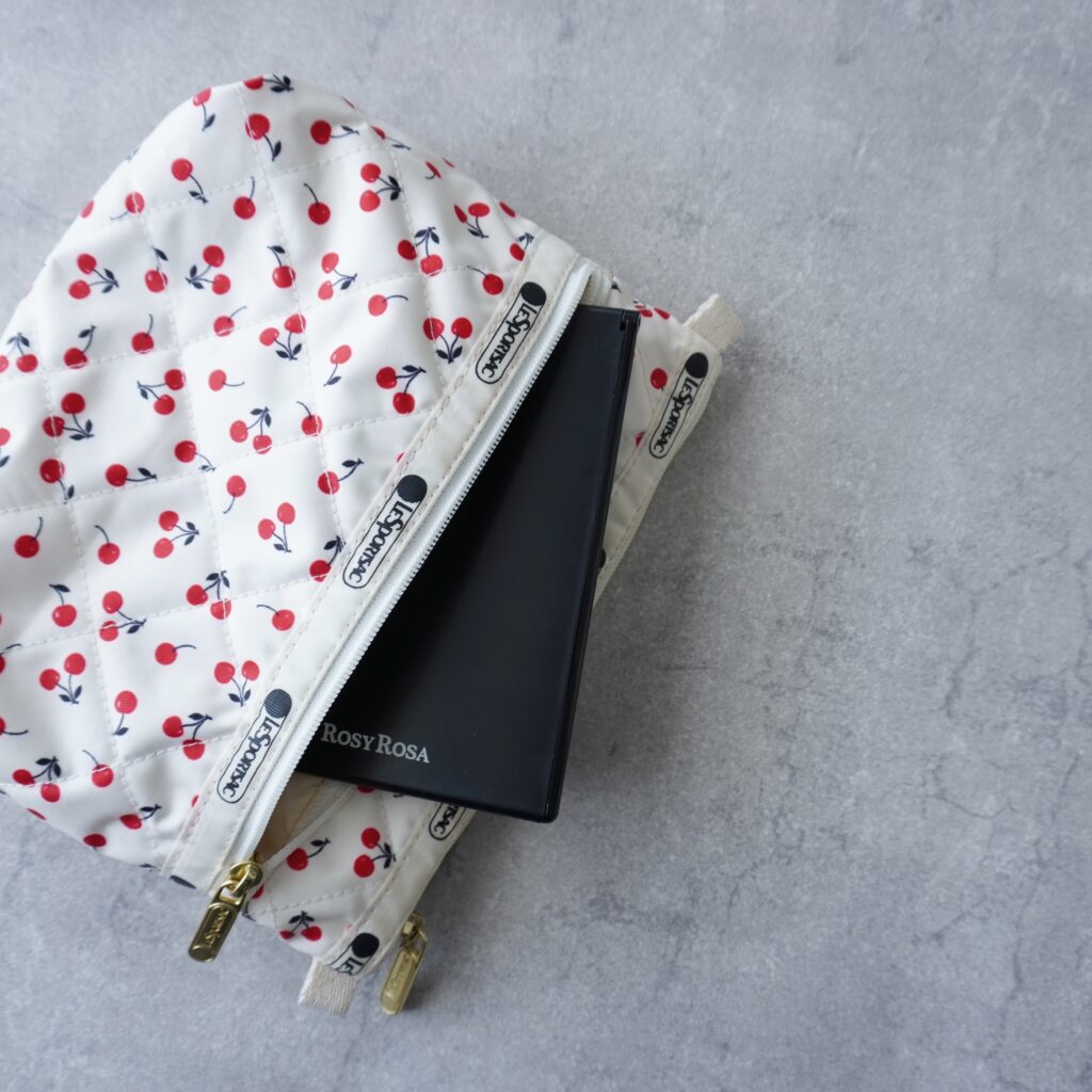 旅行へ行く時は、神崎恵さんコラボのチェリー柄レスポートサックポーチを使いますが、ブラックの方のサイズがピッタリ入ってありがたい。