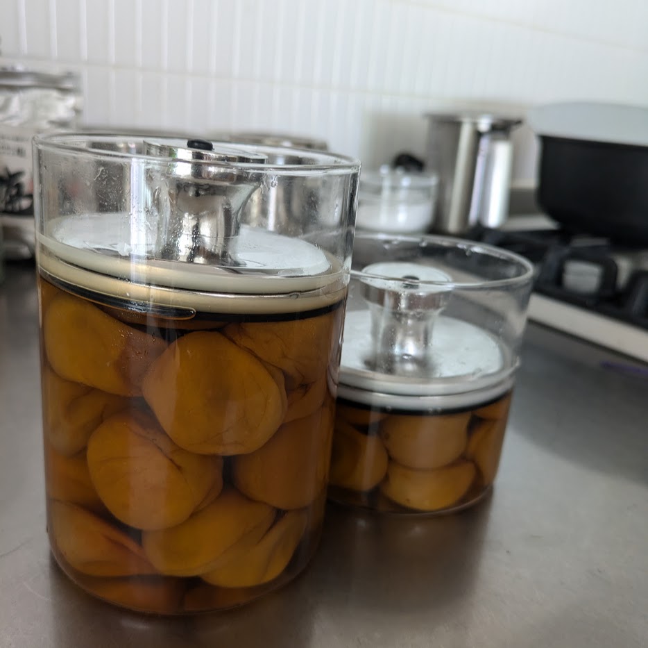大きなコンテナ瓶を沢山並べて、『何年物の梅干しです。』みたいな生活も憧れますが、置いておける場所もないし、保存の仕方がいつまで食べられるのか自信と経験がないので、冷蔵庫に頼ります。冷蔵庫に入れやすいサイズの容器を持っていると、季節の手仕事の度にコンテナを使いまわします。