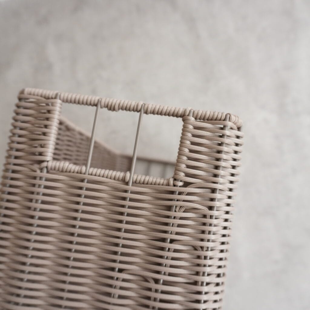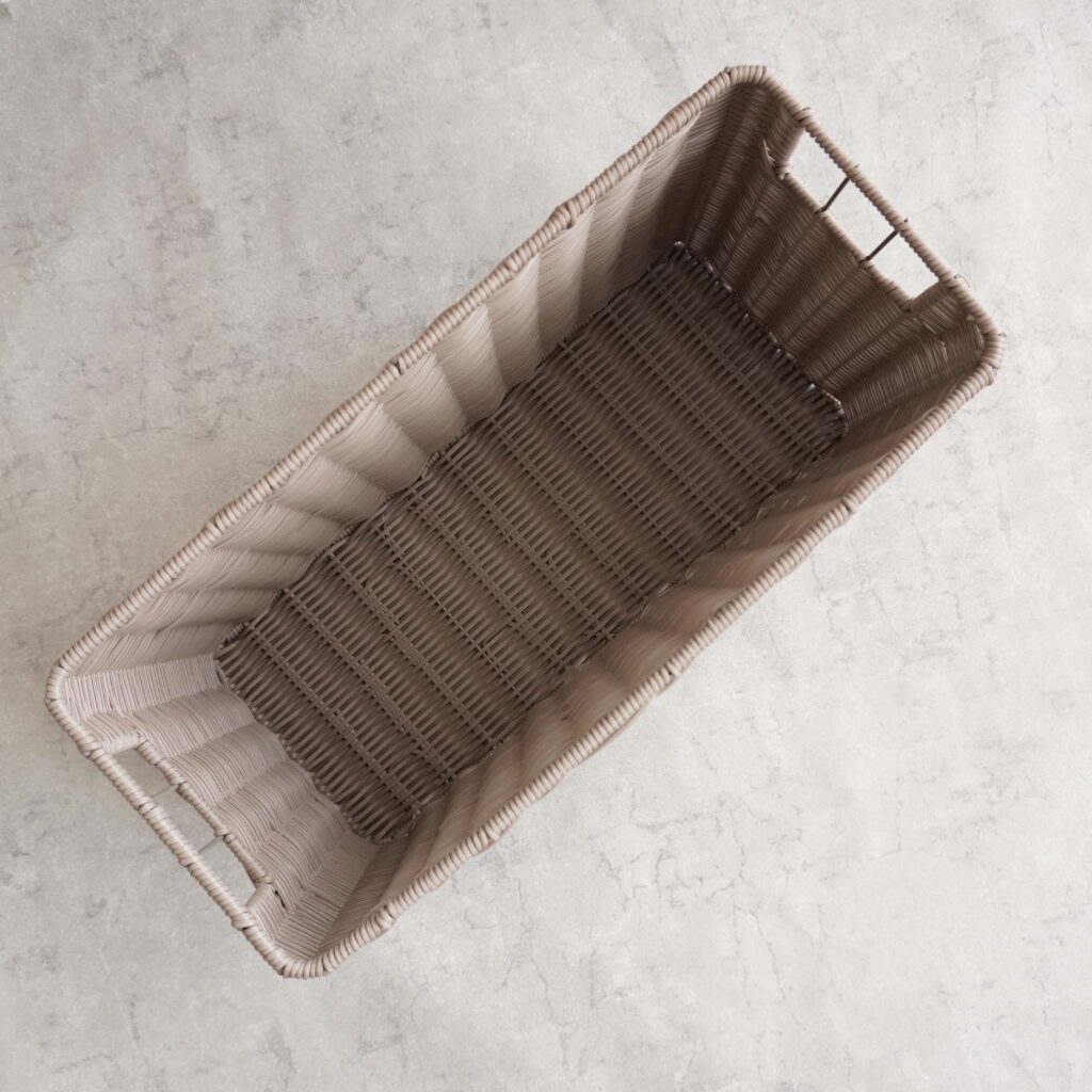 たまに、ツヤツヤつるんとした見た目のカゴもあるけれどコチラのボックスは質感も品があり落ち着いた雰囲気。インテリアの邪魔をせず嬉しいです。