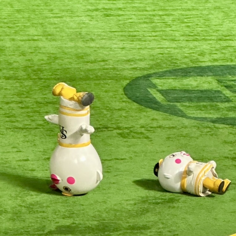 負けて絶望するホークスのキャラクター「ふうさん」と「こふうさん」。この2人も「ピンクフルデー」仕様でピンクのメイクをしています。