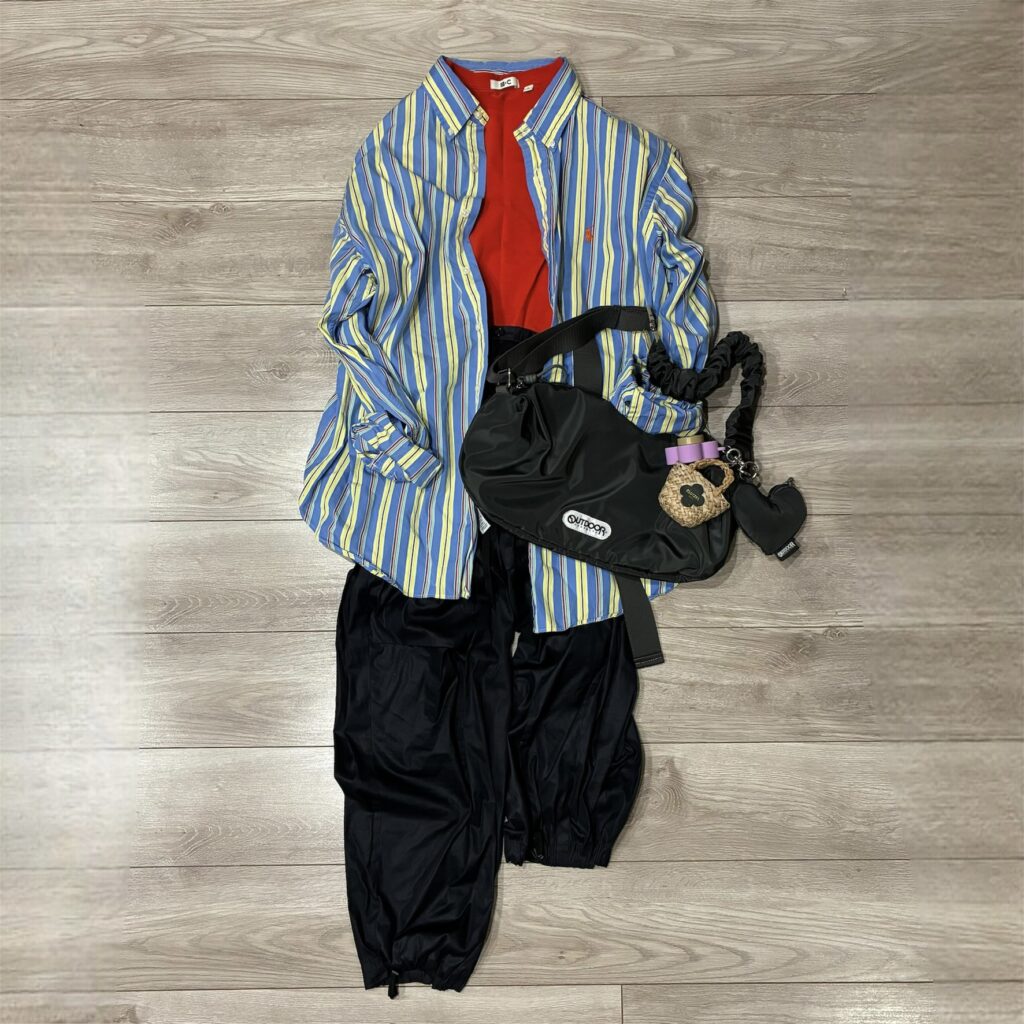 羽織ったり、腰に巻いたりとアレンジ自在のシャツコーデ。カラフルなストライプ柄なので、「スミクロ」カラーが引き締め役を担ってくれます。