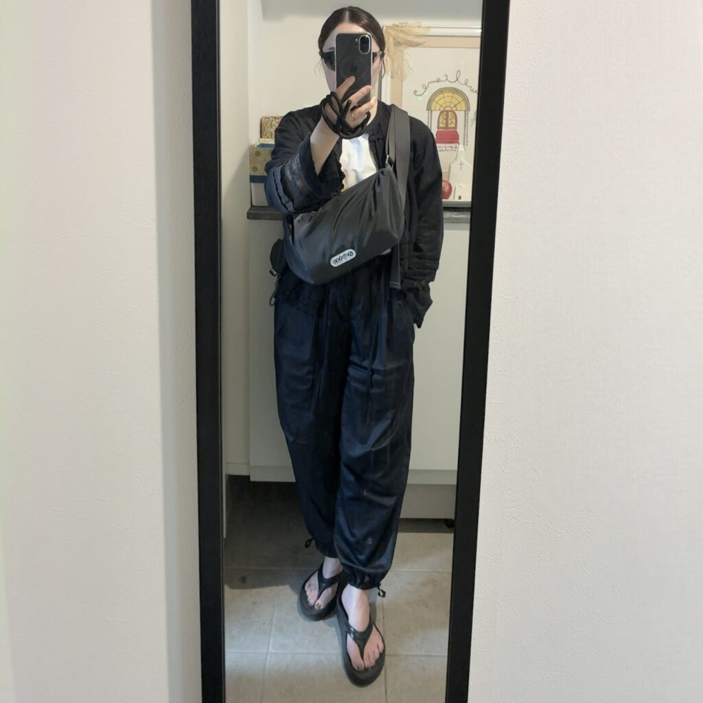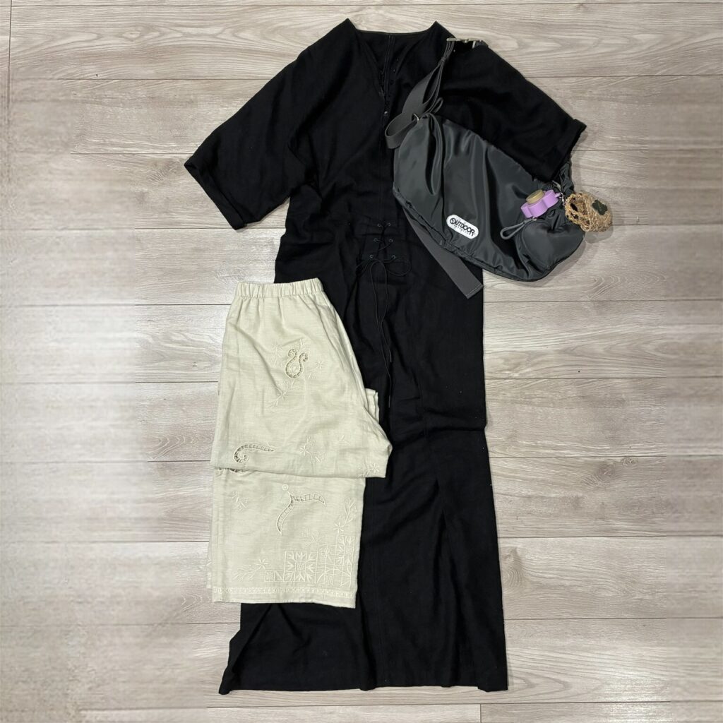 夏のMY定番、黒のマキシ丈ワンピース。去年はかごバッグをよく合わせていたのですが、今年はパンツとのレイヤードが気分。パンツ+かごバッグだとナチュラルになりすぎてしまうので、「スミクロ」カラーのバッグを合わせて、洗練さのあるスタイリングになるように意識。