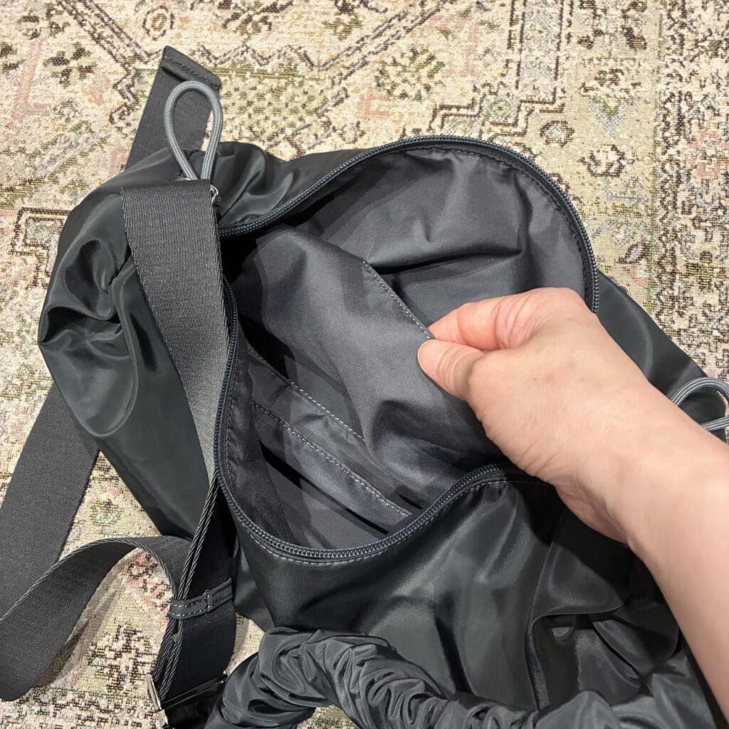 どんなシーンでも気負いなく使えるよう、光沢感があり薄い中綿入りのふんわりとしたポリエステル素材を採用。ボディバッグ型だけど品のある雰囲気に。