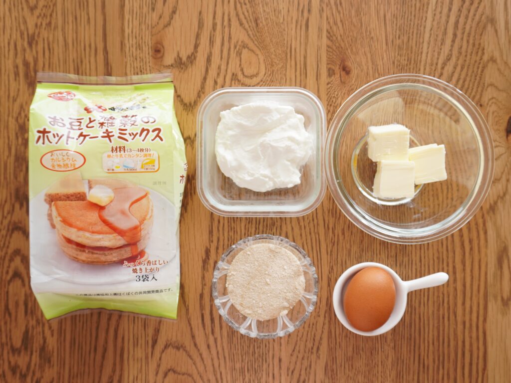 ホットケーキミックス、バター、たまご、砂糖(我が家は、きび砂糖)