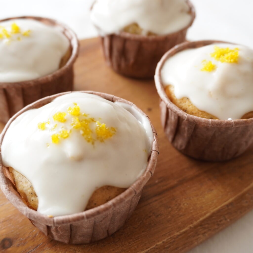 冷めたカップケーキにアイシングを塗っていきます。瞬きせずに全集中で塗りましたよ〜飾り用に残しておいた、すりおろしたレモンの皮をパラパラっと。30分くらい放置して乾かしていきます。