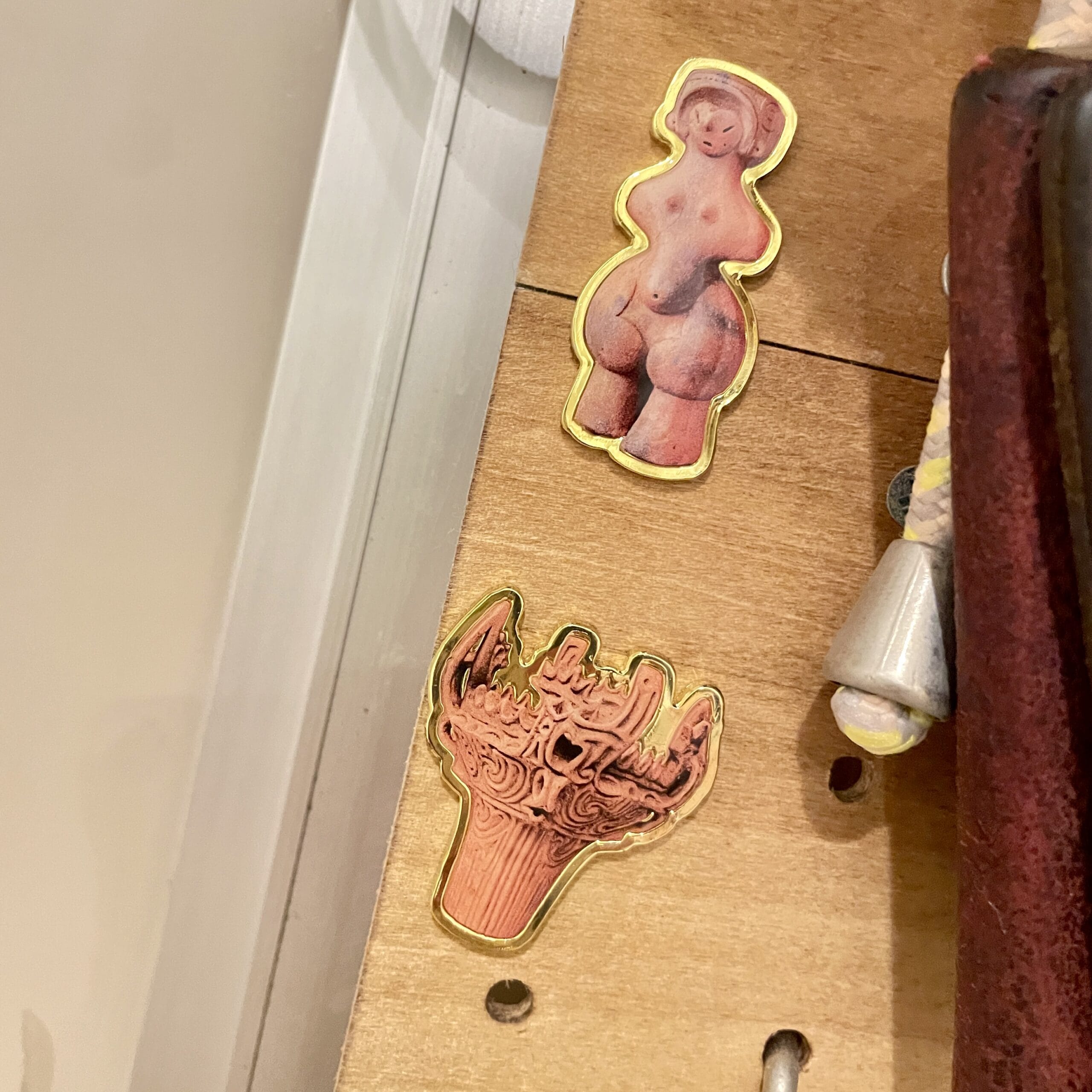 お土産は、ガチャガチャで当てた、ビーナス土偶と火焔型土器のピンバッチ。