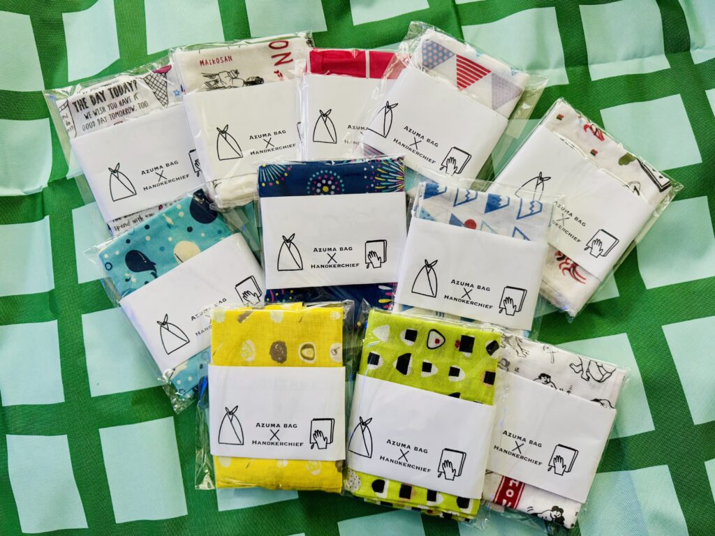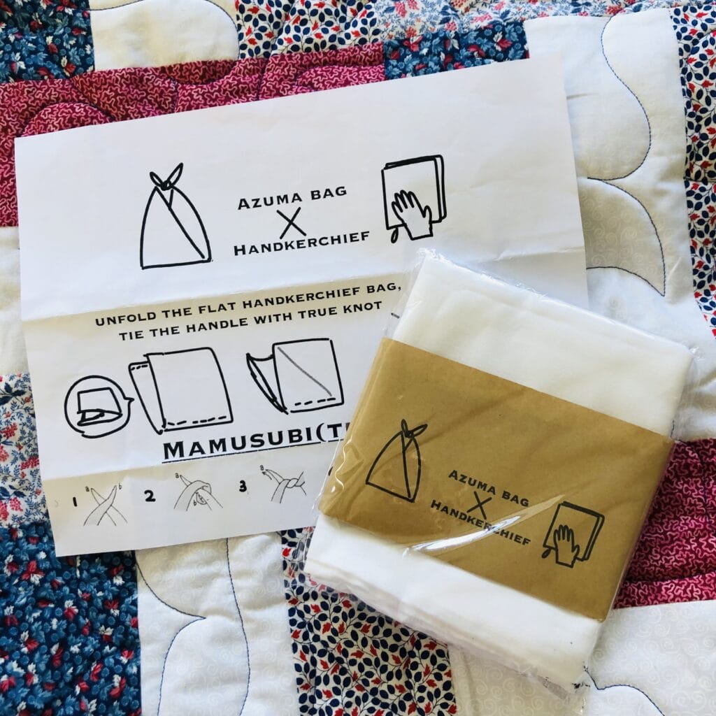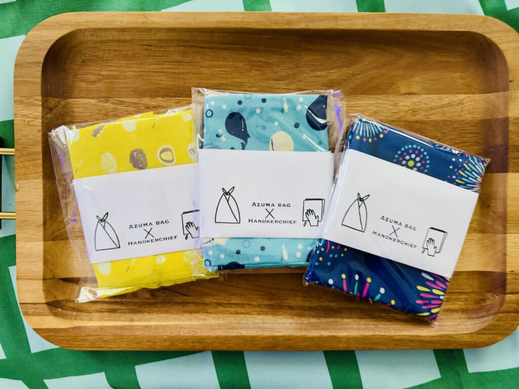 あずま袋は毎年帰国するたびに集めている手ぬぐいのコレクションで作りました。ハンカチにもミニバッグにもなるよ。というコンセプトをパッケージデザインにしてみました。