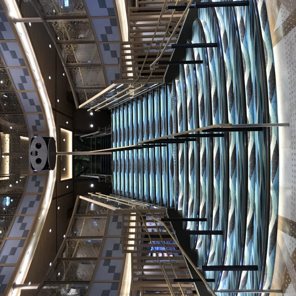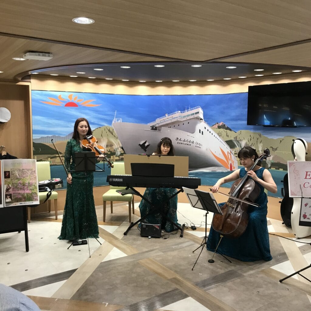 乗船すると広いロビーでヴァイオリン、チェロ、ピアノのアンサンブルによる演奏でお出迎え。
