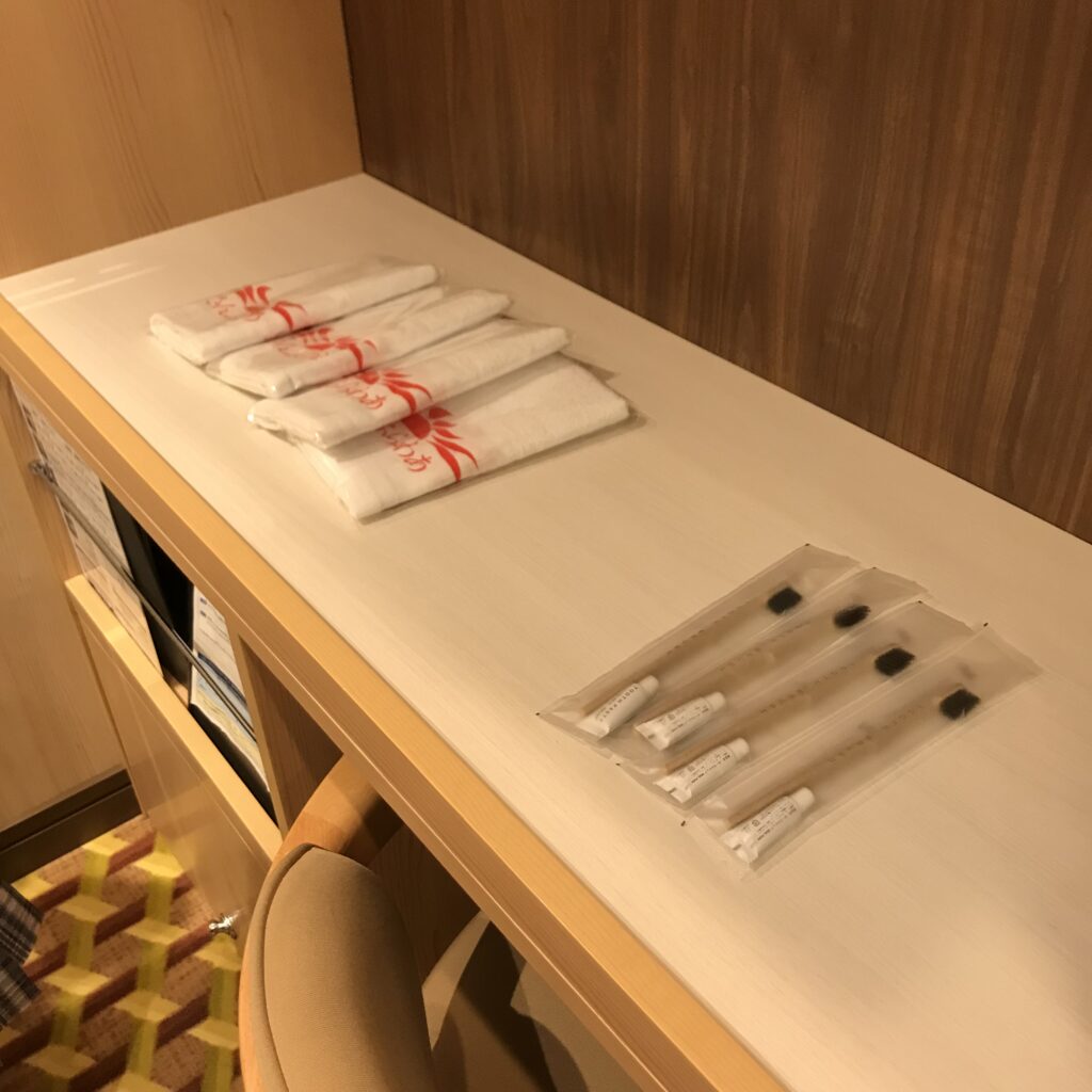 フェイスタオル、歯ブラシセットが机に置かれてます。
