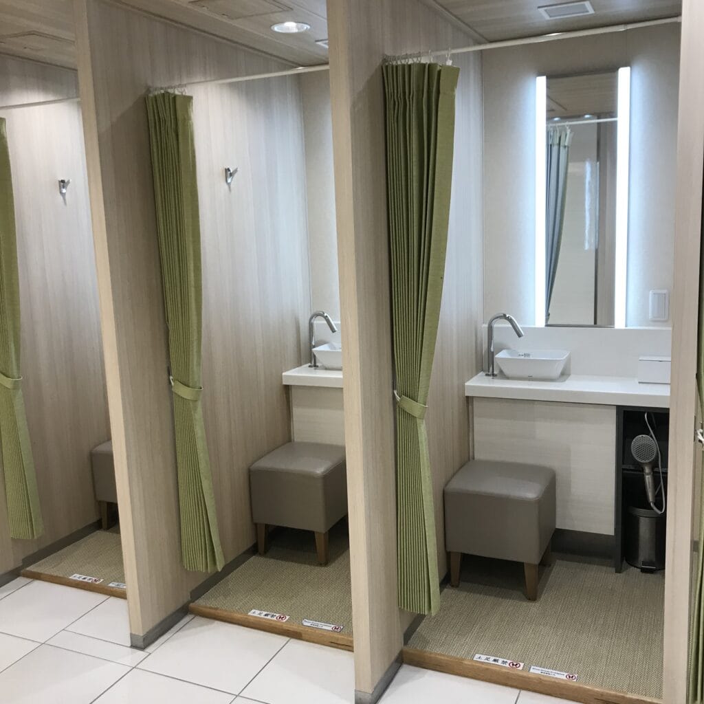 入ってすぐ手前にパウダールームが何室かあり、鏡全てにライト、ドライヤーが完備されてます。まるで百貨店のパウダールームのよう。