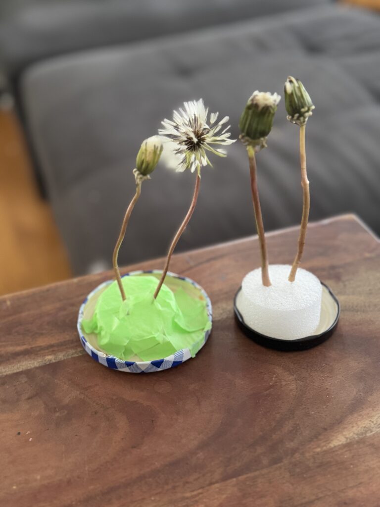 あとは綿毛が開くのを待ちます。 茎を洗った影響で湿度が高かったのか瓶が曇ったので被せていた瓶を一時解放。