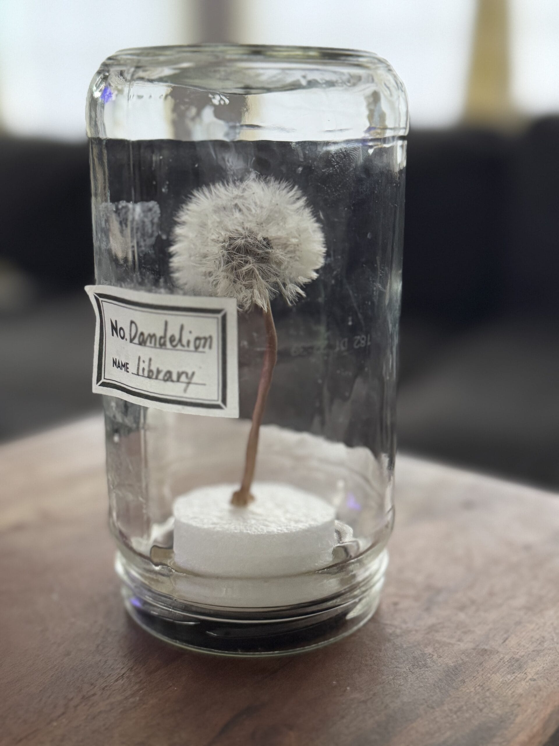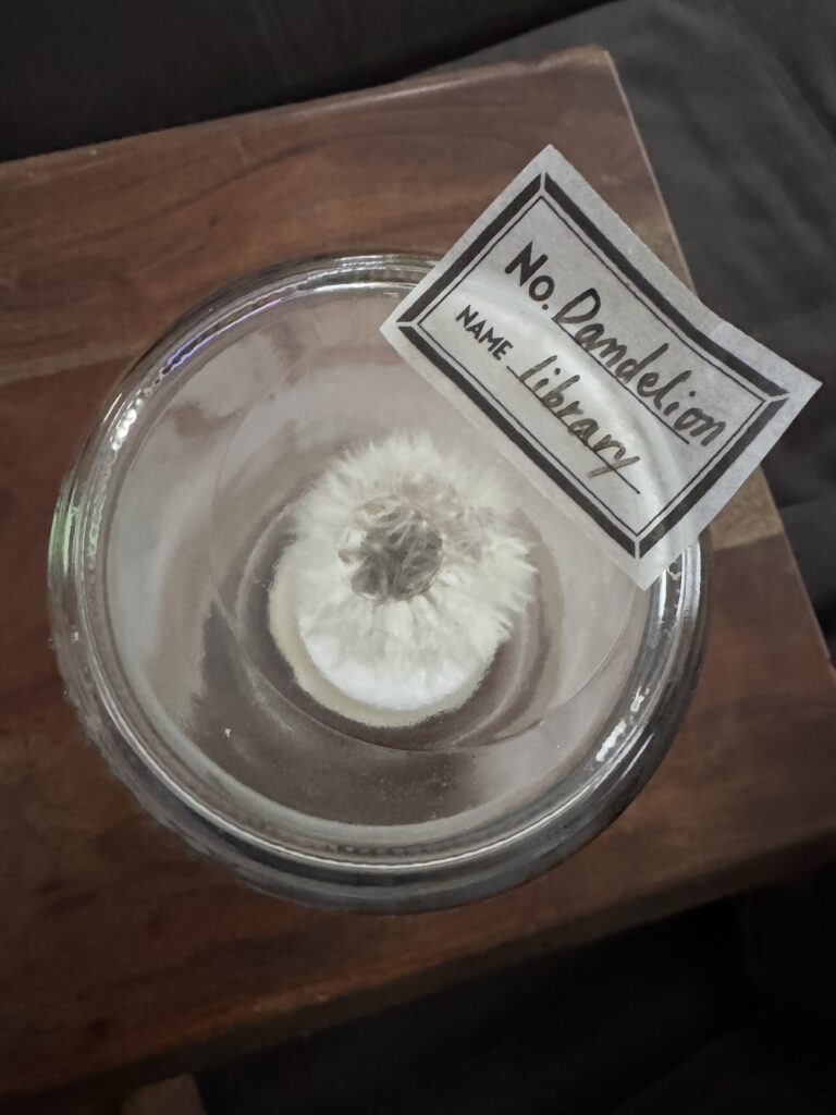 以前綿毛部分だけ標本にしたときは持ち運ぶたび綿毛が転がって、その度にタネがフワリ、、と中心から離れてしまってまあるい形ではなくなってしまったので今回は茎ごと保存。