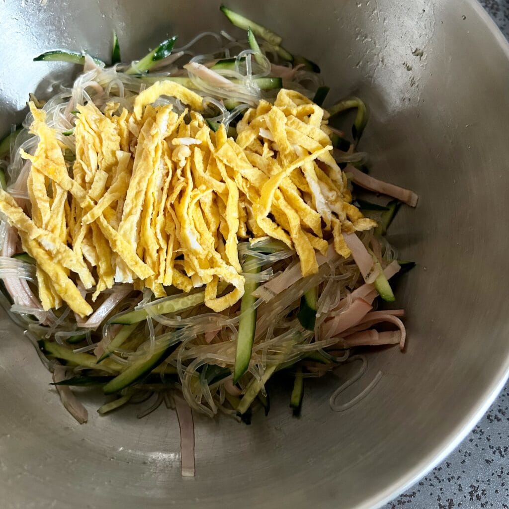 春雨を茹でて、ハムときゅうりと調味料入れて和えて、薄焼き卵をさくっと和えたら…