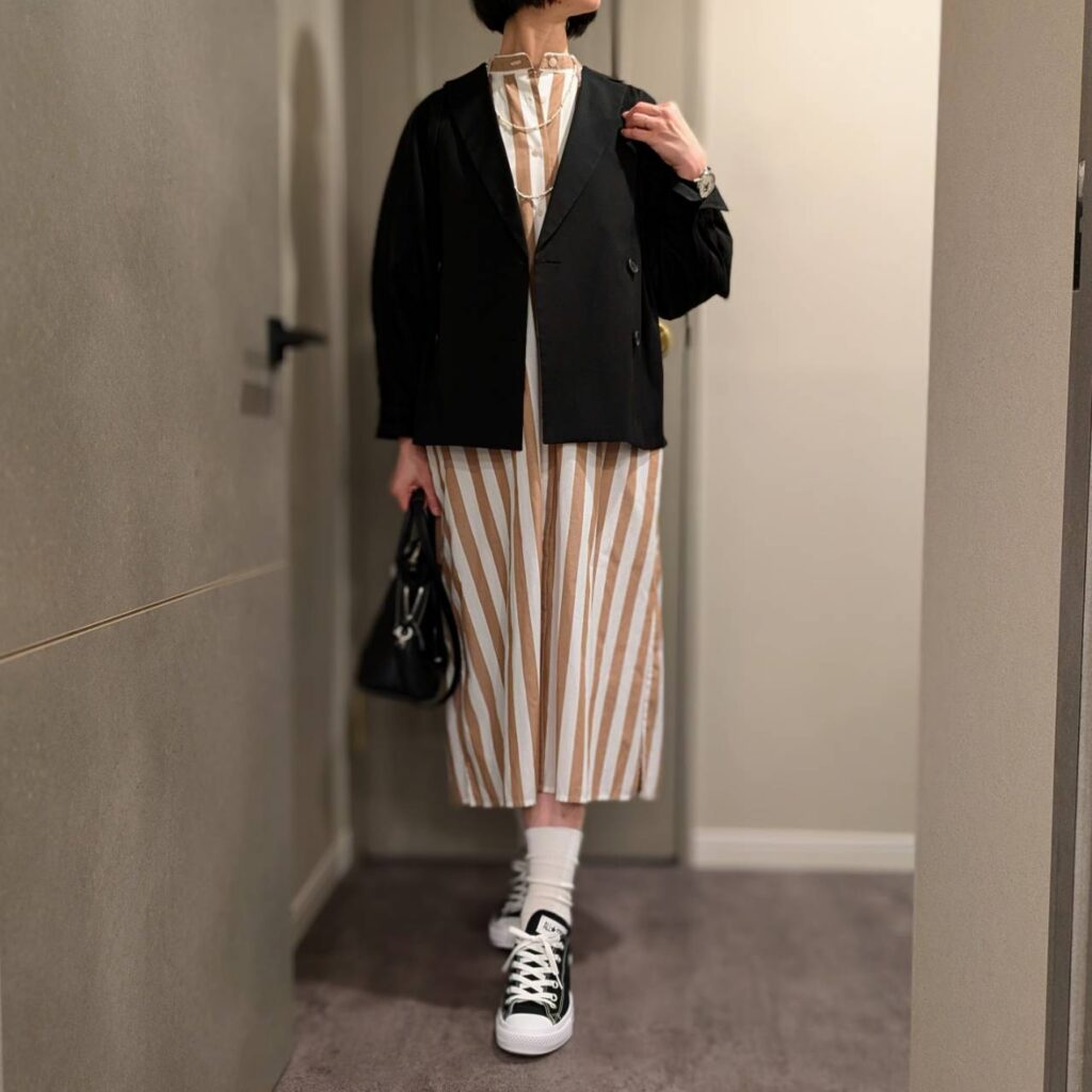 黒羽衣ジャケット×ベージュストライプシャツワンピ