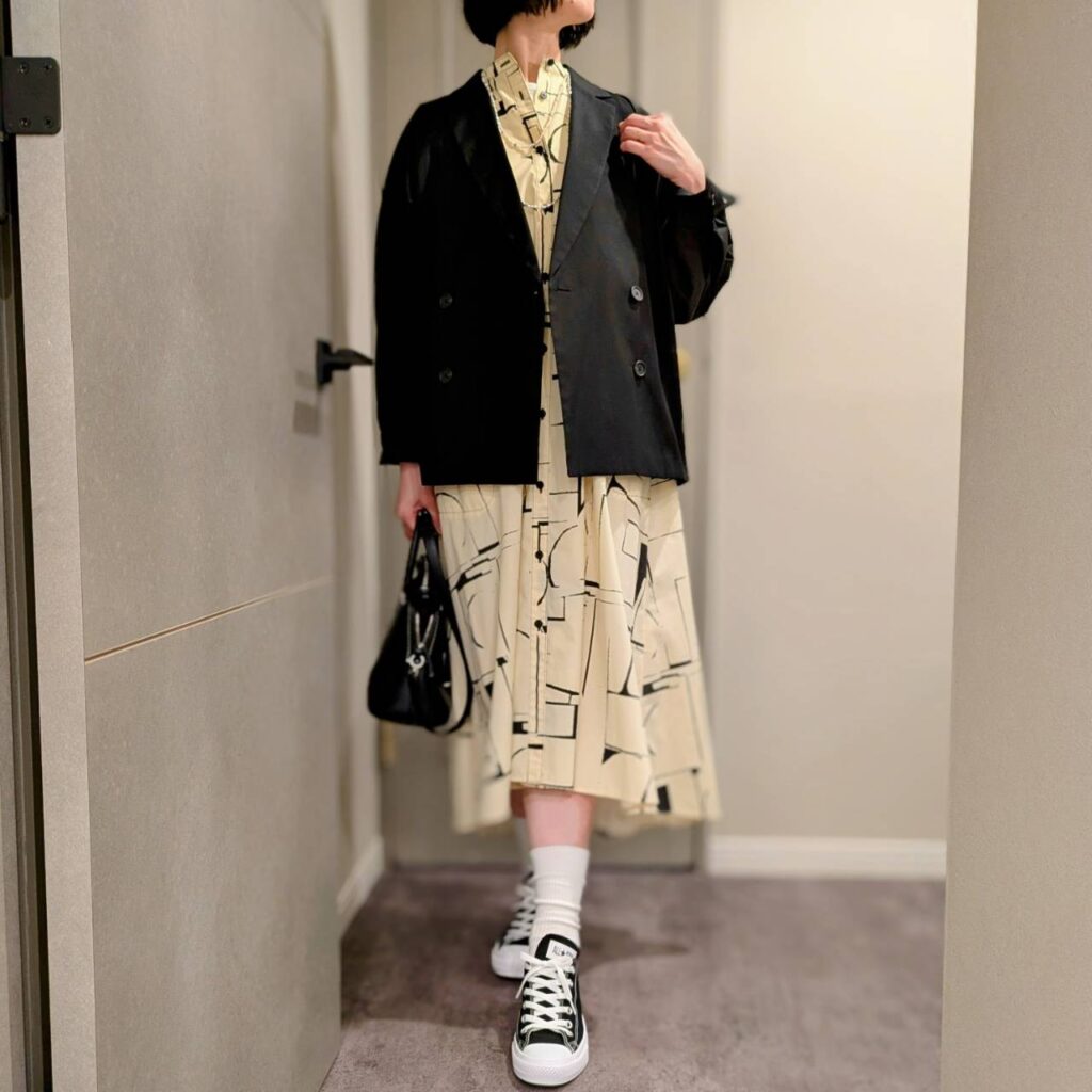 黒羽衣ジャケット×ベージュ柄シャツワンピ