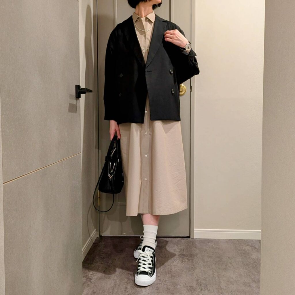 黒羽衣ジャケット×ベージュ無地シャツワンピ