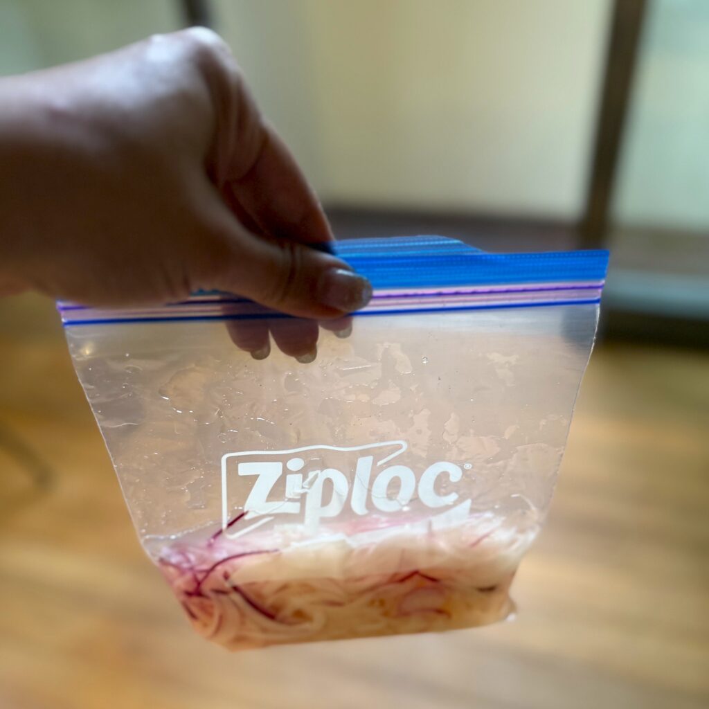 ジップロックに入れて保存しましたが、しばらくすると玉ねぎがピンク色に染まって