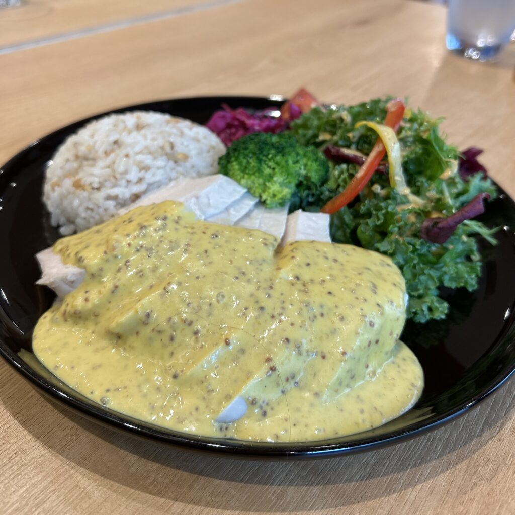 ランチメニューは6種類ほどあったにも関わらず、3人とも同じメニュー[鶏むね肉の塩麹漬け ハニーマスタード]を選び、同じドリンク[白桃ティー]を選びました(笑)