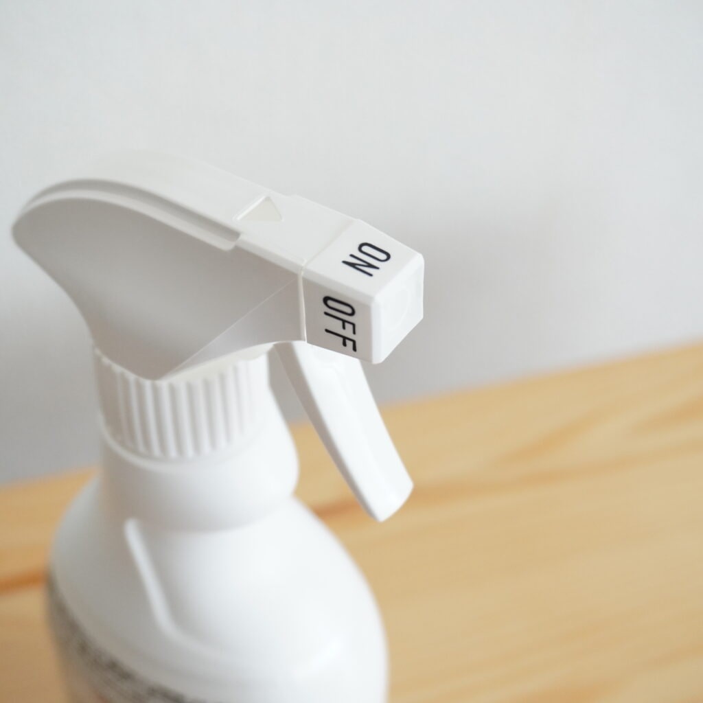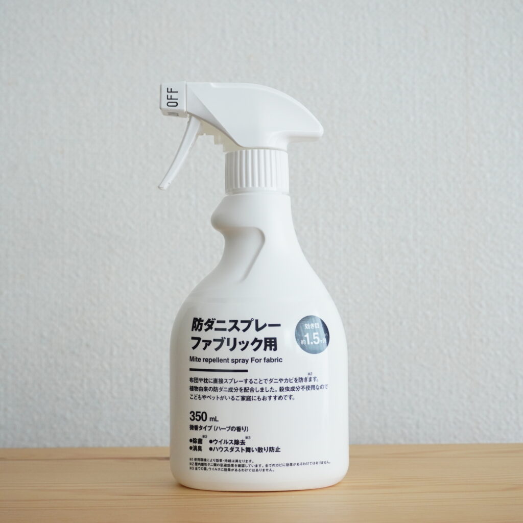 防ダニスプレーはハーブの香り。吹きかけた時は香りを強く感じるかもしれませんが、時間が経つと香りは薄まります。寝具に使う場合、香りに敏感な方は朝のうちにシュッシュしておくといいかもしれません。