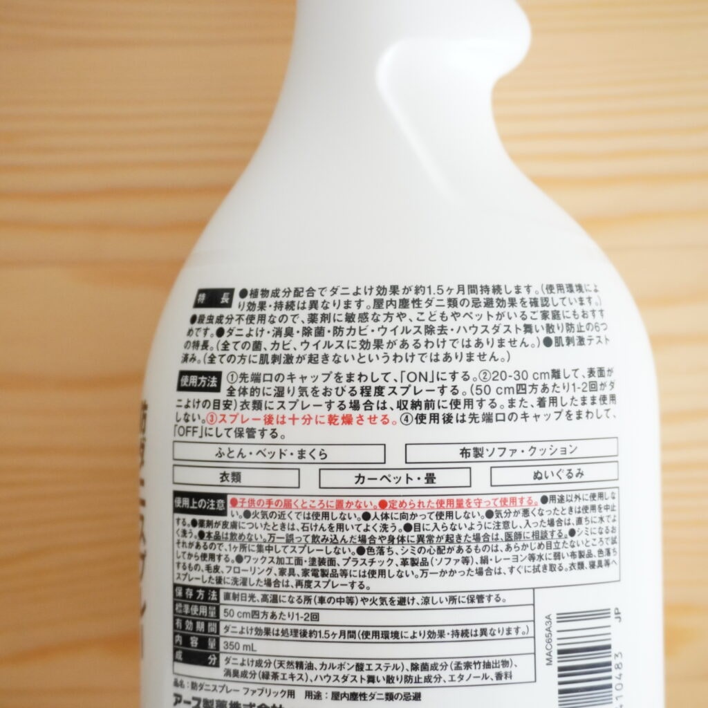 植物成分配合で、一度シュッとすればダニよけ効果は約1.5ヶ月は持続されるとのこと。