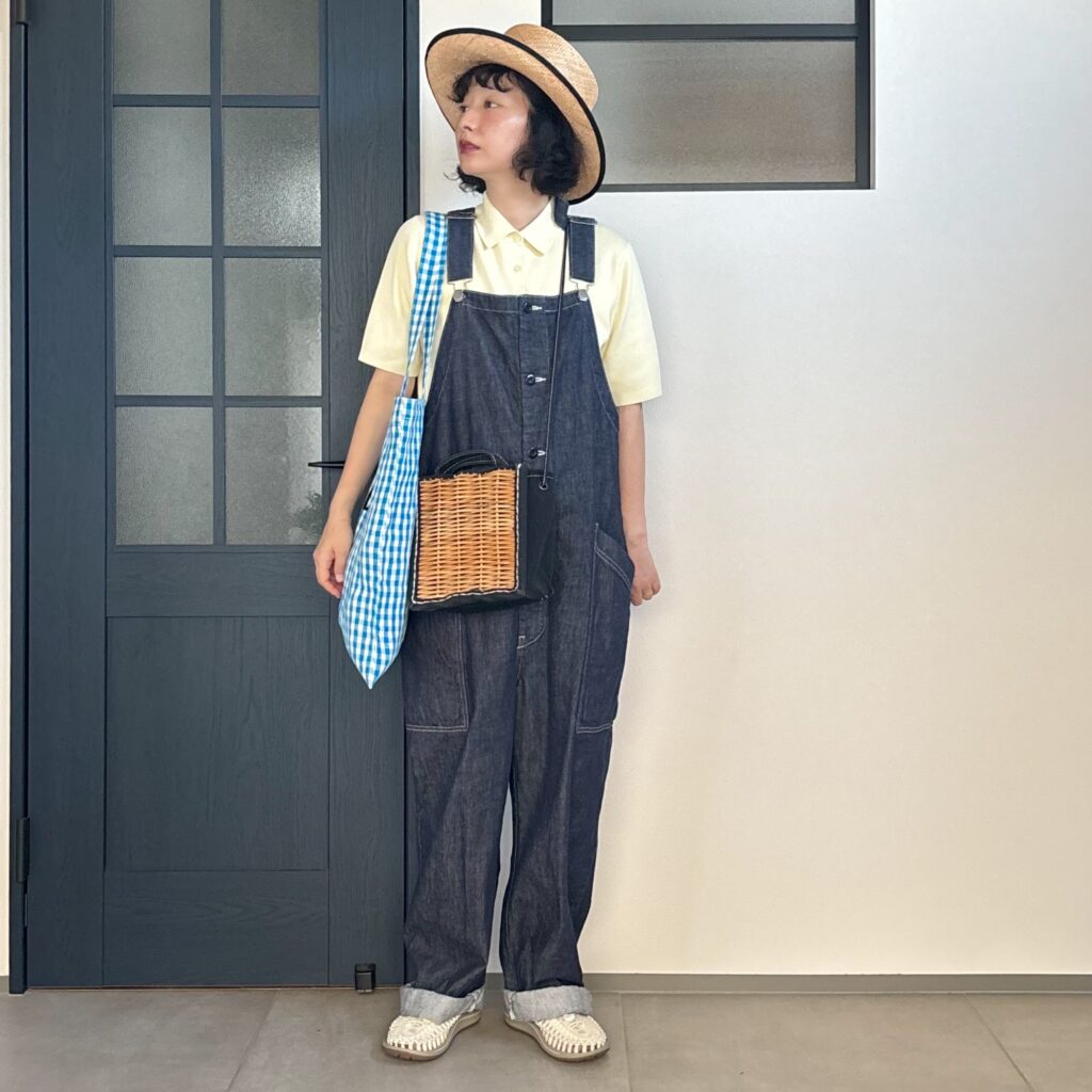 Tシャツ+オーバーオールだと少年感が漂ってしまいますが、襟付きのポロシャツならカジュアルになりすぎない。