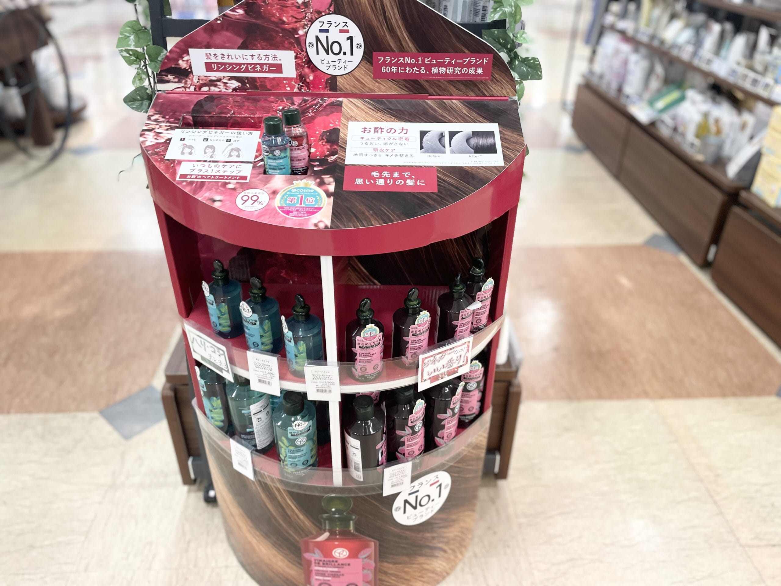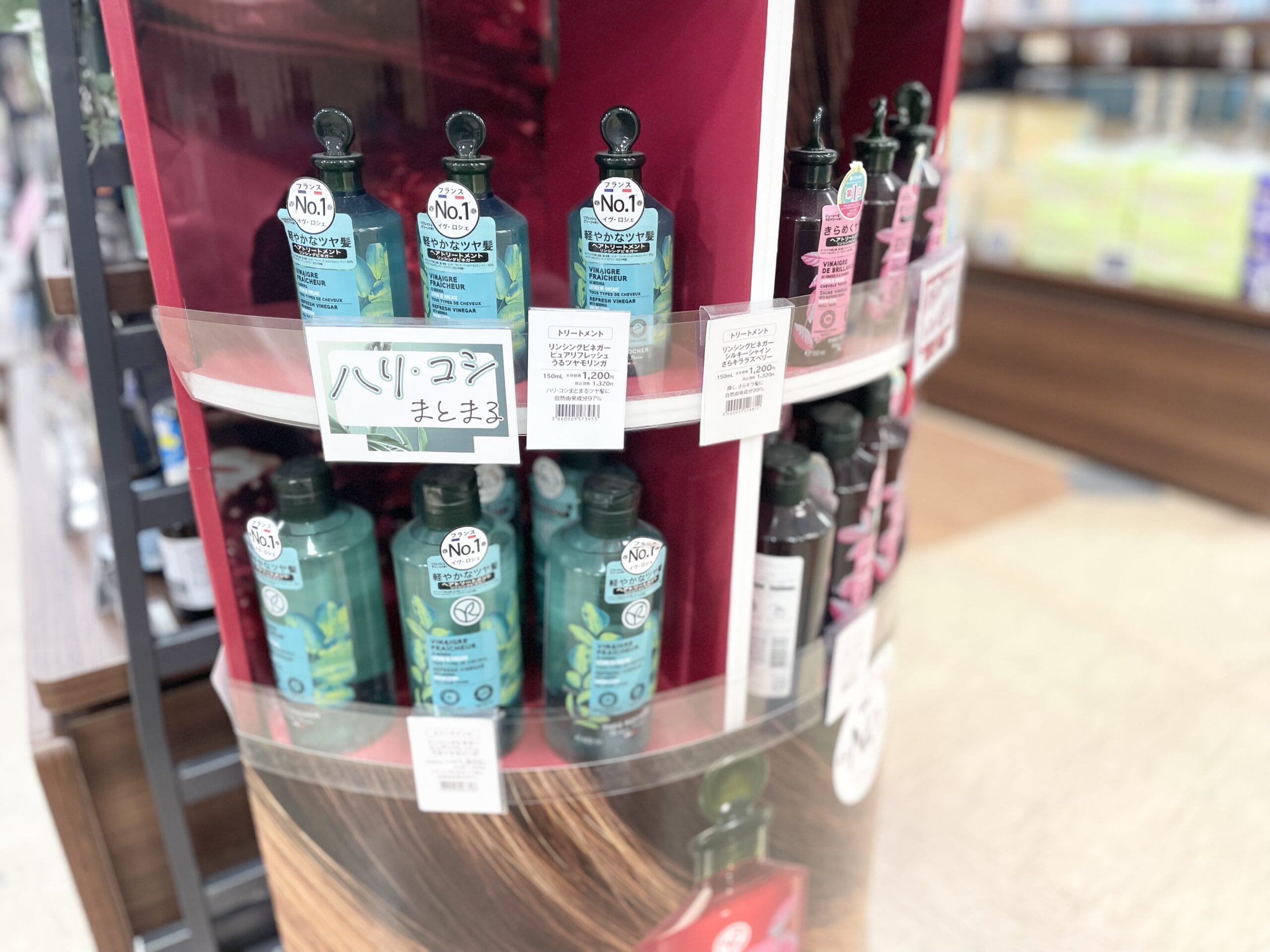 ナチュラルなデザインのパッケージが目を引き、植物由来の成分を活かしたコンセプトが伝わってきます。特に、ヘアケア商品のコーナーでは、リンシングビネガーシリーズが目立つ場所に並べられており、人気の高さが感じられました。