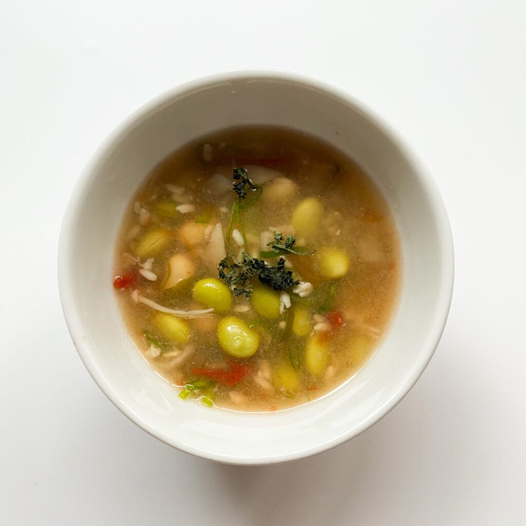 ある日のス―プ。残り物の野菜と大豆や枝豆を入れました。