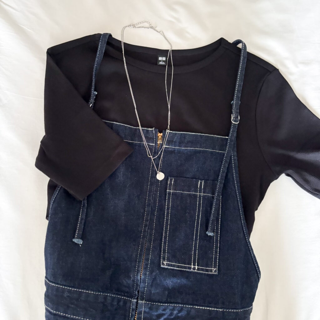 このリブボートネックTを見た時に1番初めに思い浮かんだのはサロペットとのコーデでした。
