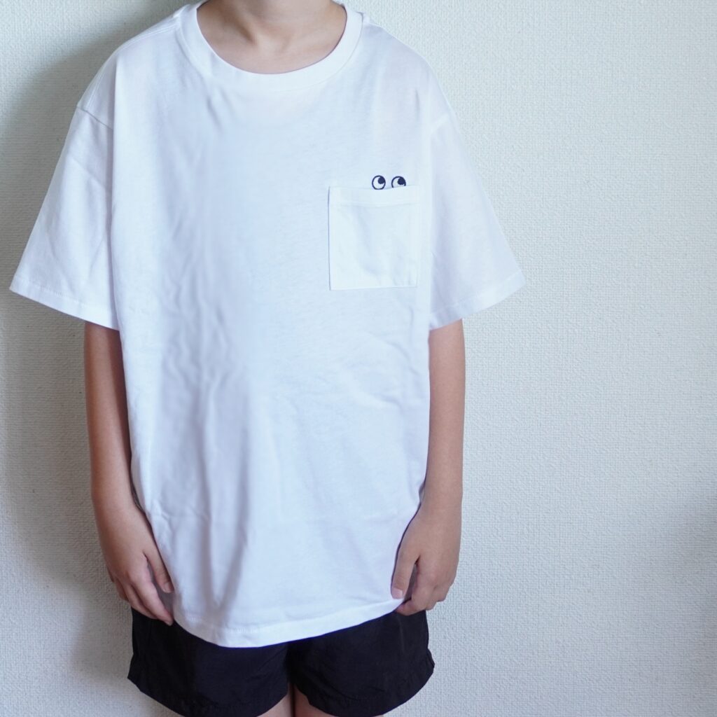 シンプルなホワイトTシャツに胸ポケットから目がきょろっとのぞいている可愛いデザイン。