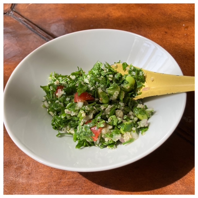 私が好きな組み合わせはタマネギ、トマト、枝豆にキヌアを混ぜたタブレ。