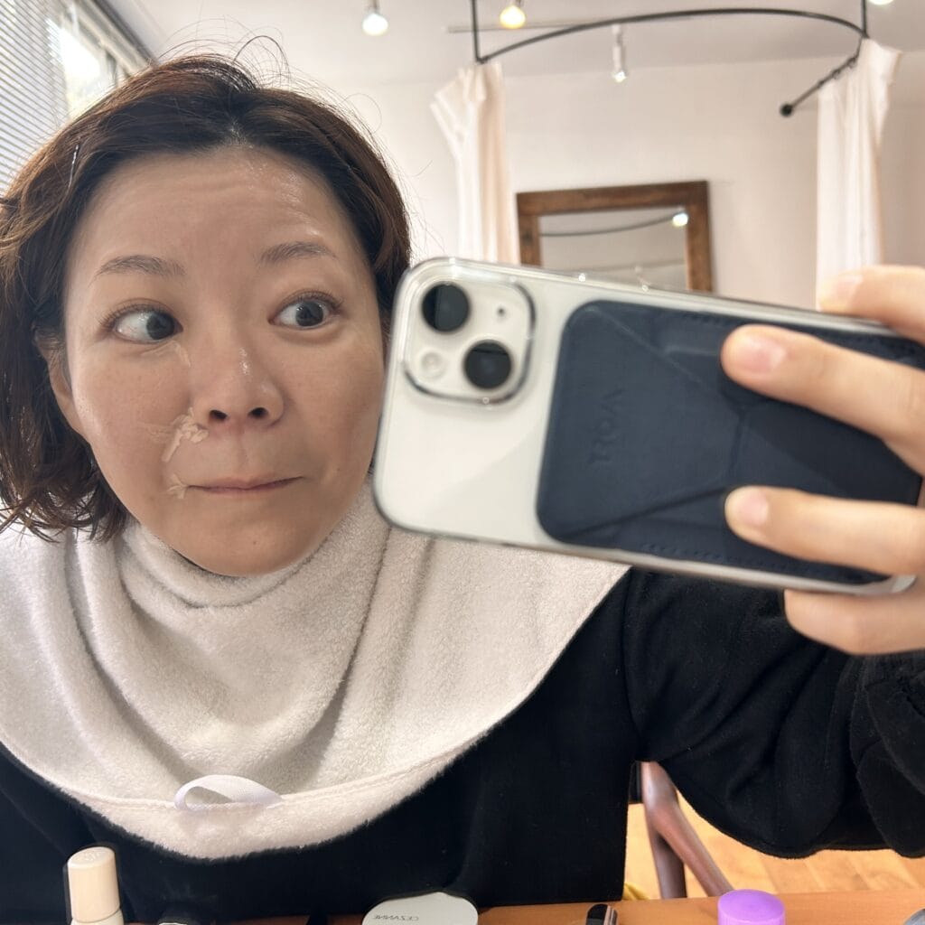 毛穴が目立つ鼻やほっぺにくるくる〜と馴染ませると、毛穴をぼかされて質感もサラサラになります。