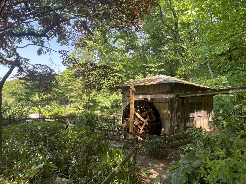 薬師池の畔(ほとり)には、水車小屋が。かつては水車の力でお米を精米していたそうです!案内看板によると、“この水車は、市内大蔵町在住の水車の名工金沢留吉翁が青少年の教育に資し、かつ薬師池公園に風情をそえる目的をもって製作寄贈された”ものだそうです。