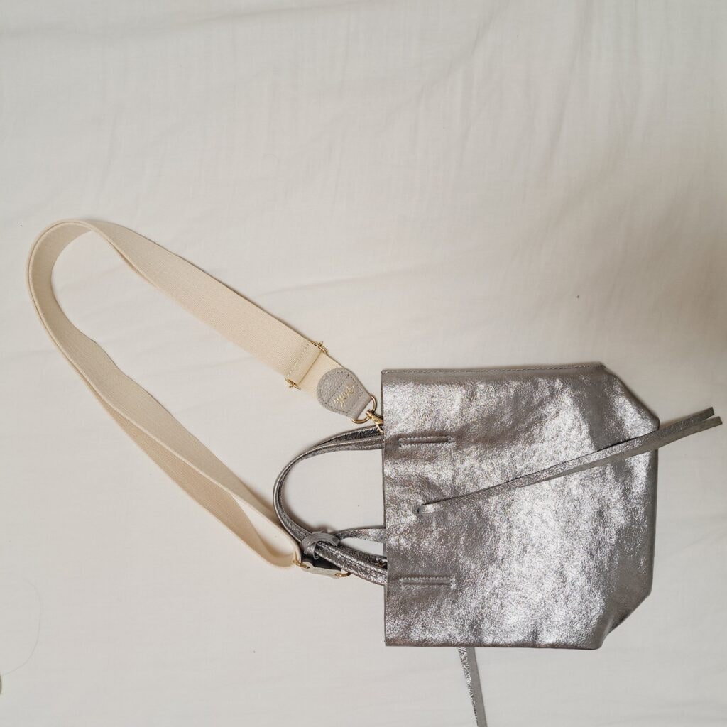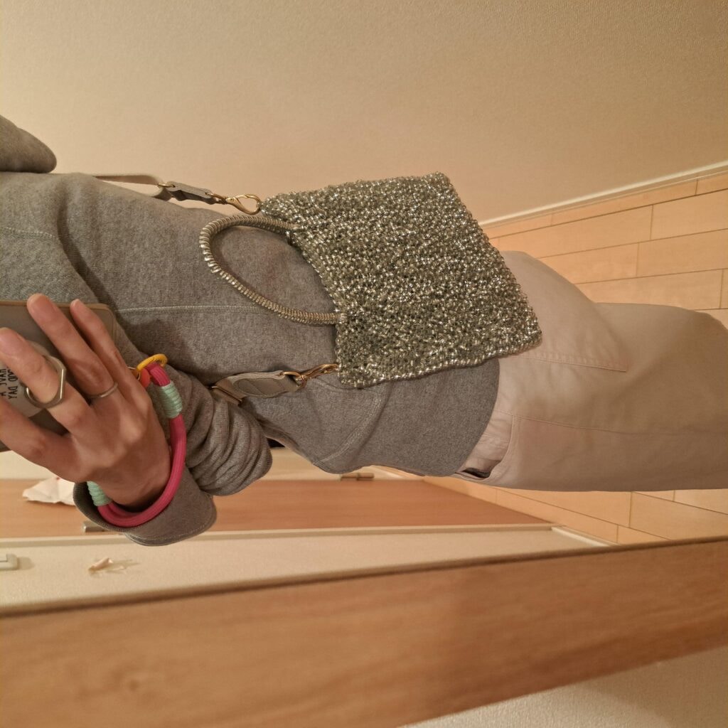 全然買う予定ではなかったのに、「これから こどもの送り迎え用に、さっと斜め掛けできていいんじゃない!?」と購入したシルバーのバッグ。