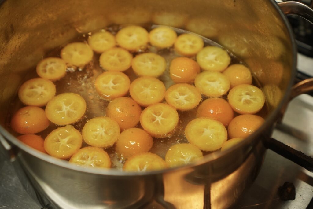 金柑を洗って、種を取り除いて、お鍋に水と砂糖と白ワインを加えてゆっくり煮ていきます。