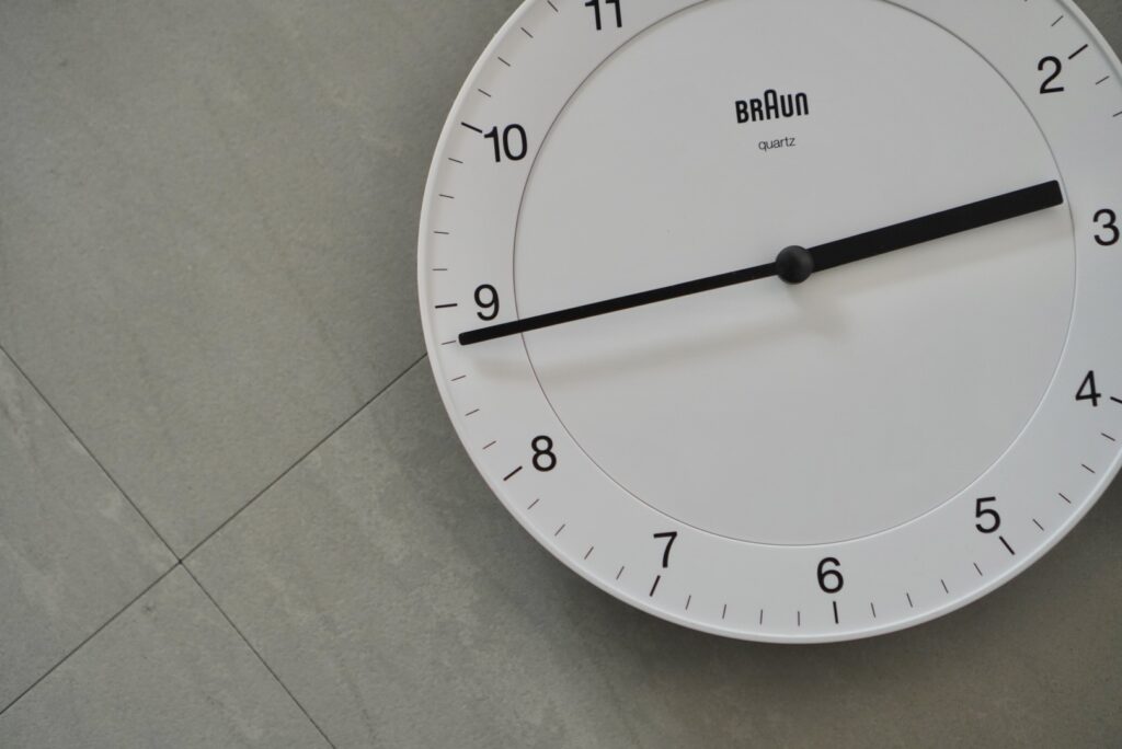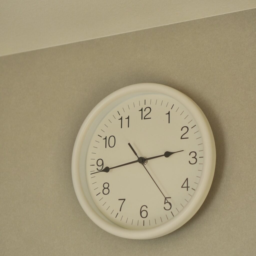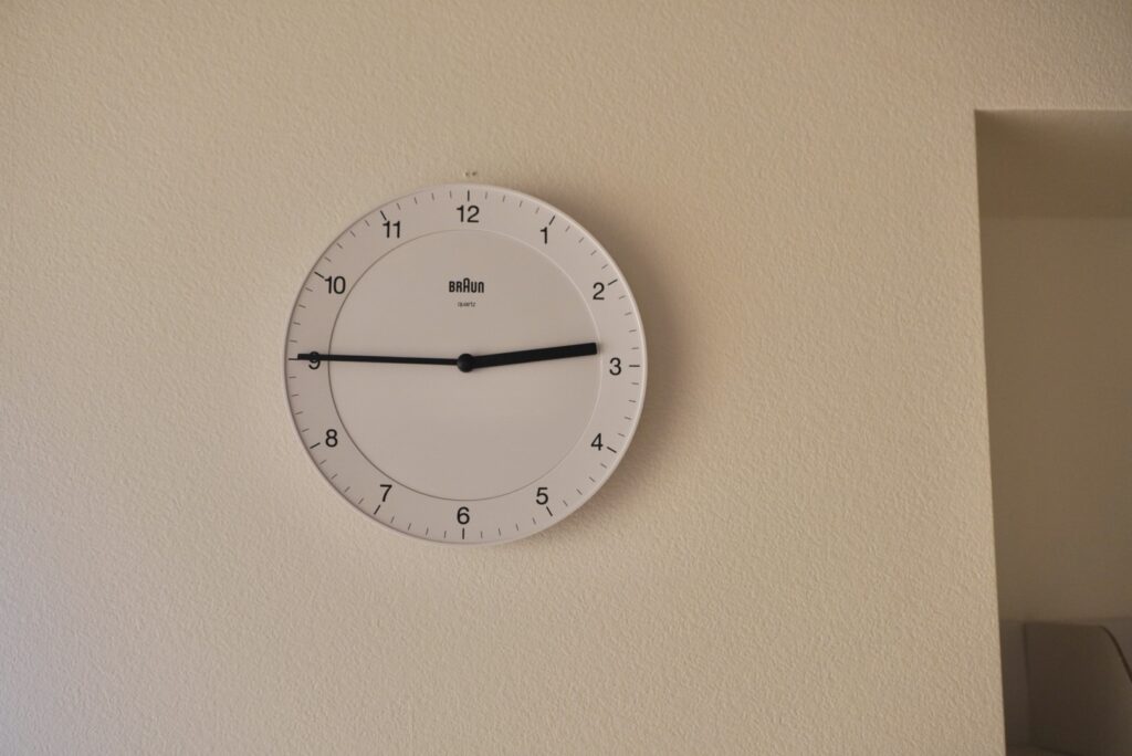 こちらはフリースペースに置いている真っ白なデザインがお気に入りの、アナログ時計。