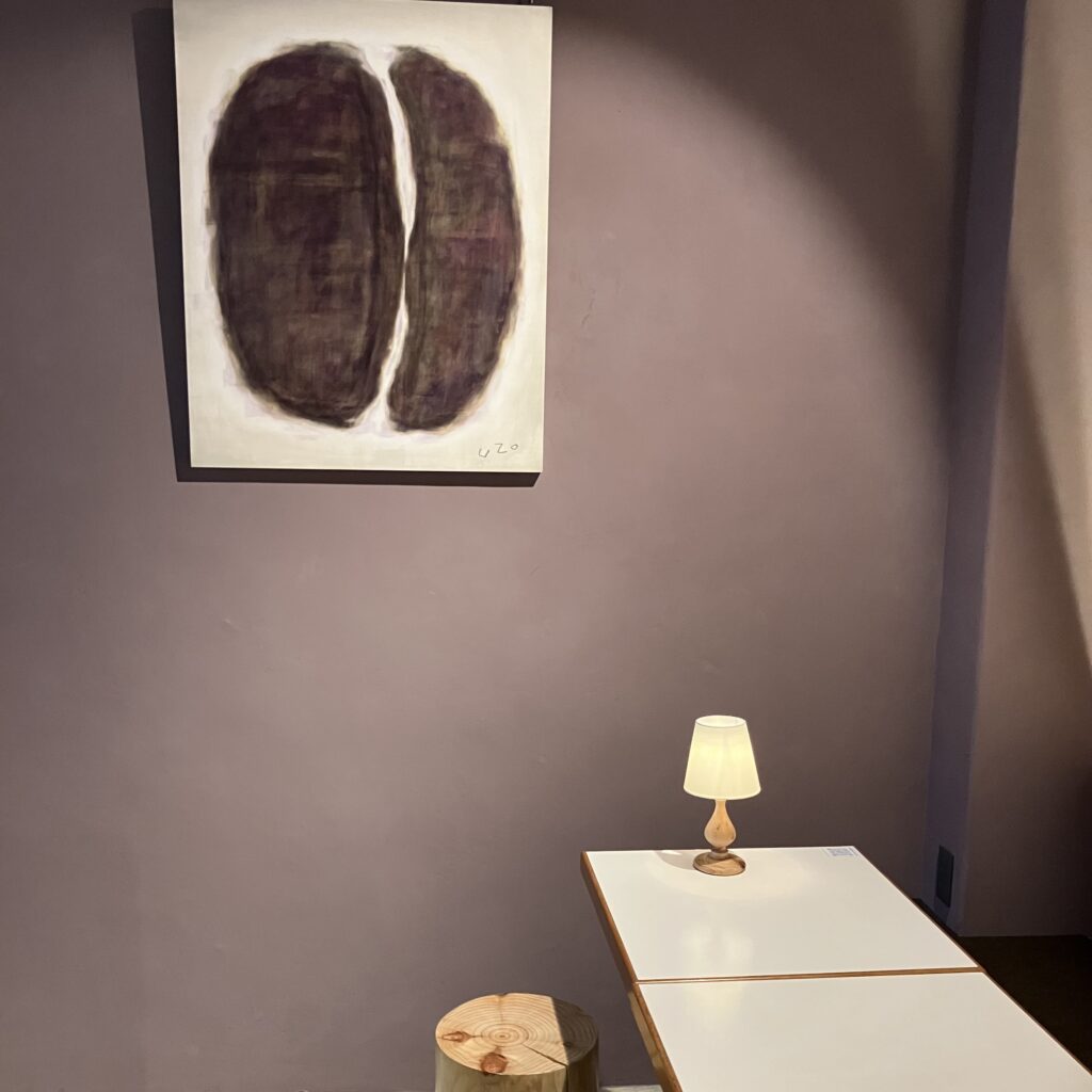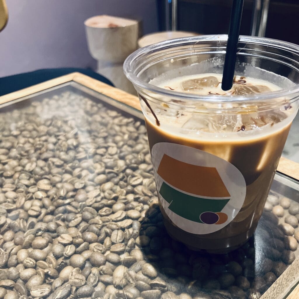 コーヒーを買ったついでに、イートインでコーヒーもいただいて帰りました。テーブルに埋め込まれたコーヒー豆。
