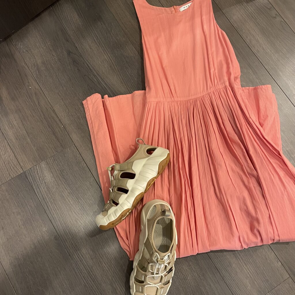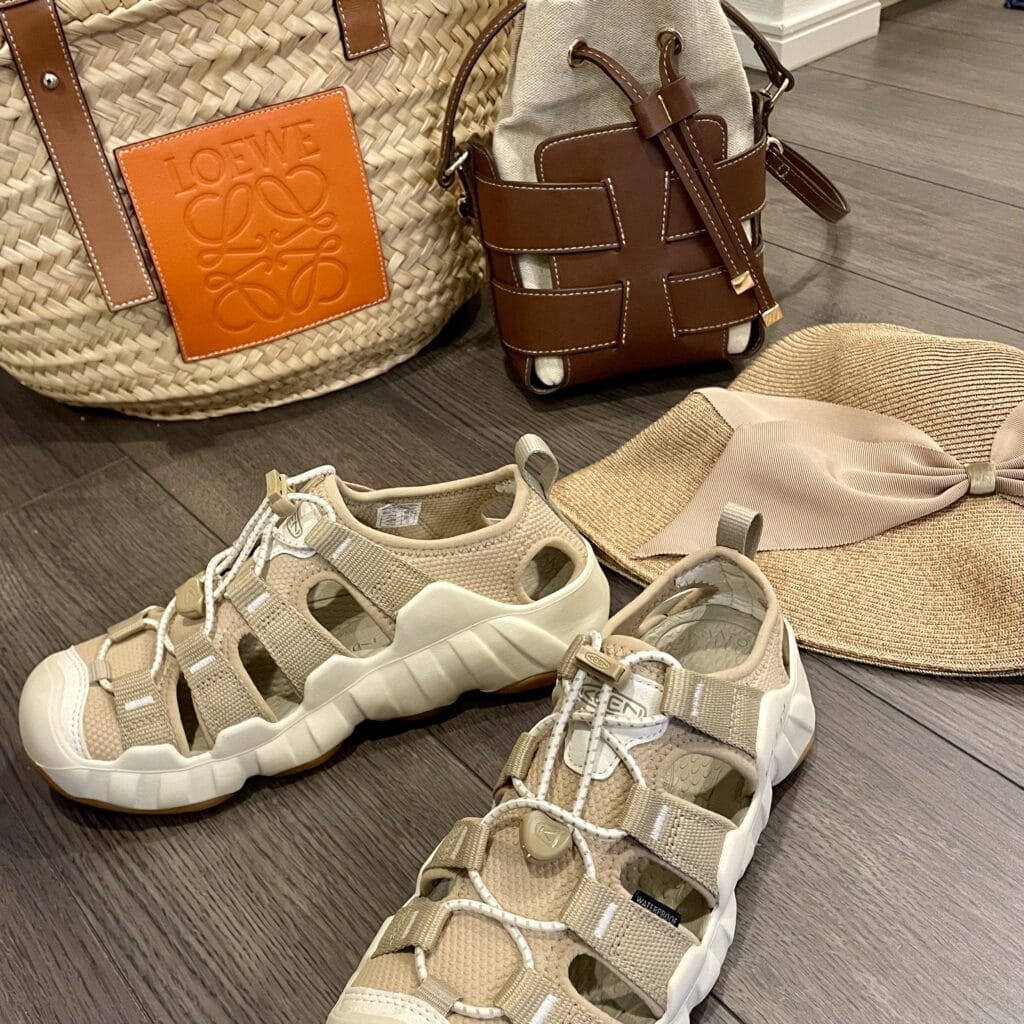 暑い時期はカラフルな服を着たくなるので、小物は茶色/ベージュ系でまとめるとコーデしやすいなと思っています。KEENのサンダルと、手持ちの小物も合わせやすそうです。