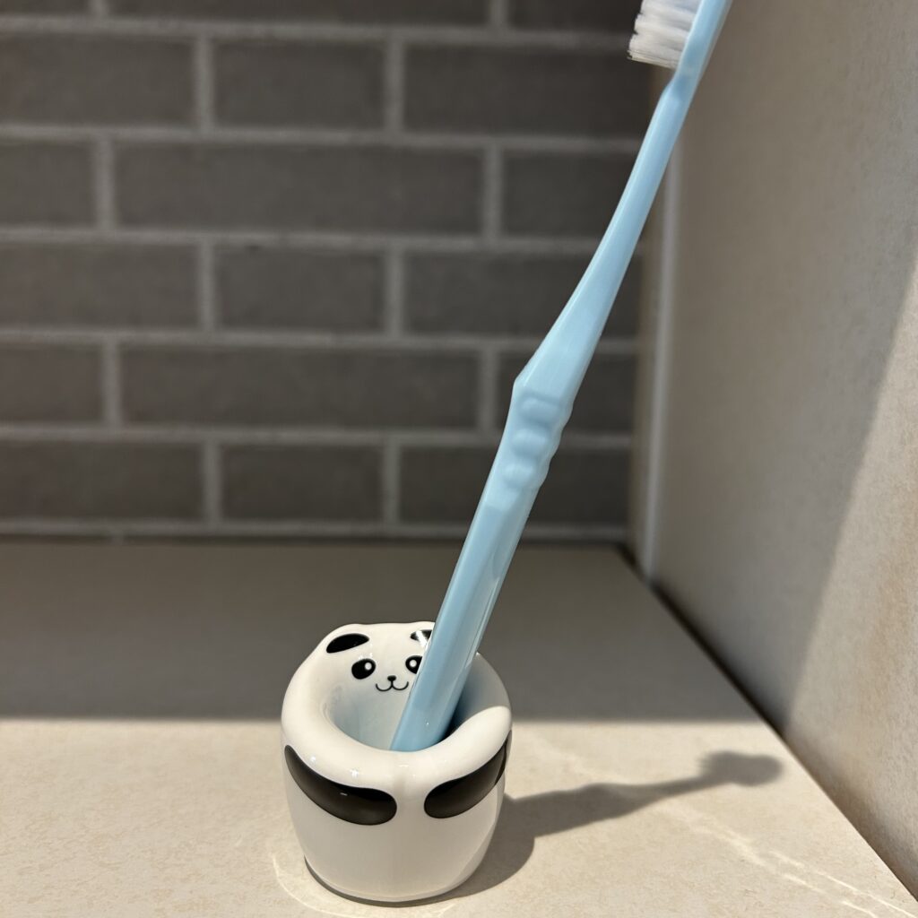 歯ブラシを抱きかかえているよう。パンダって、白と黒だからかインテリアにも馴染む気がする。笑
