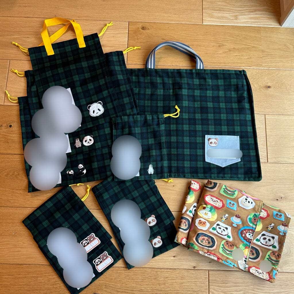 私の両親にめちゃくちゃ協力してもらい作った通学グッズ。ユザワヤや100円均一などで購入したパンダのワッペンをつけています。生地が暗いグリーンのチェックなので、かわいいけど幼すぎなくてお気に入りです。右下は給食のときに使うランチョンマットです。楽しく給食を食べてくれているといいな。