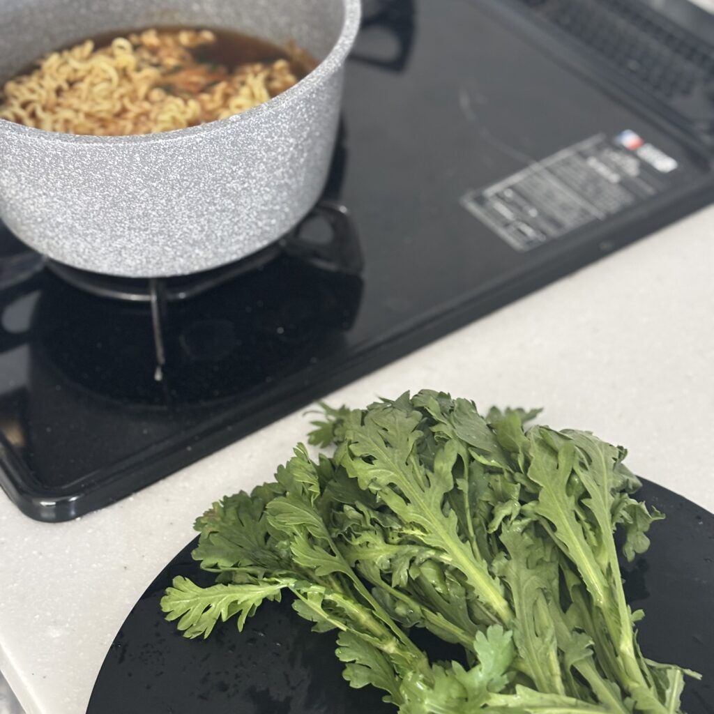 辛ラーメンってトッピングが無限だと思うのですが、私のおすすめは春菊!