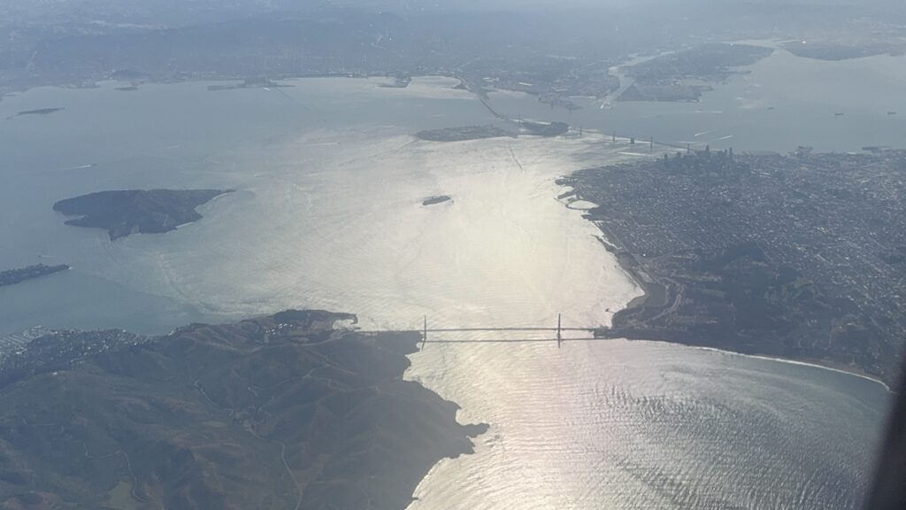 ゴールデンゲートブリッジ(たぶん)が見えてきたらもうすぐサンフランシスコ到着。