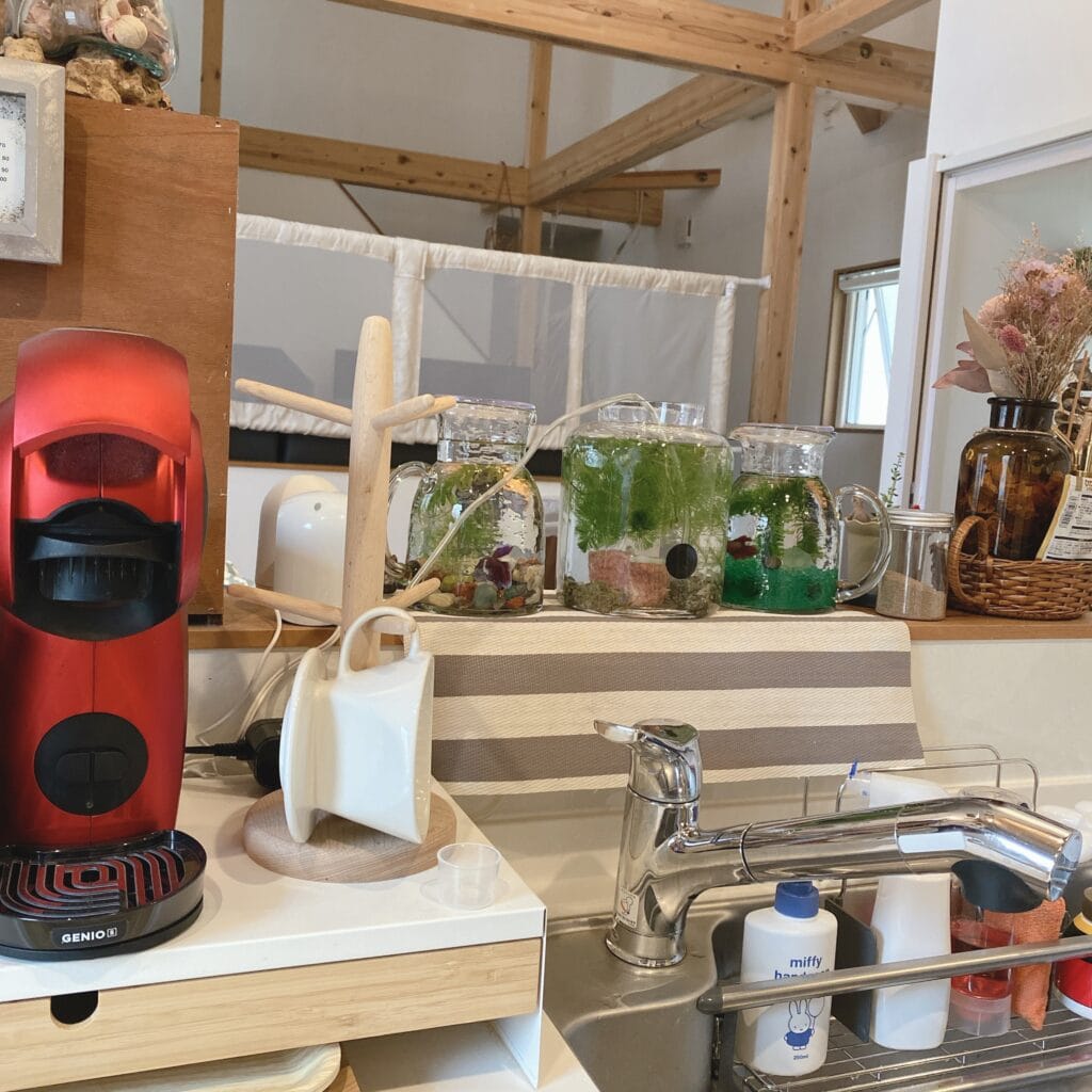 初めはベランダで飼っていたのですが、わざわざ見に行かないといけないので、なんだか寂しい感じに…。今は室内飼育で、みんなが自然と注目してお世話がしやすいように、キッチンの小さなカウンターの上に水槽を設置するようにしました!